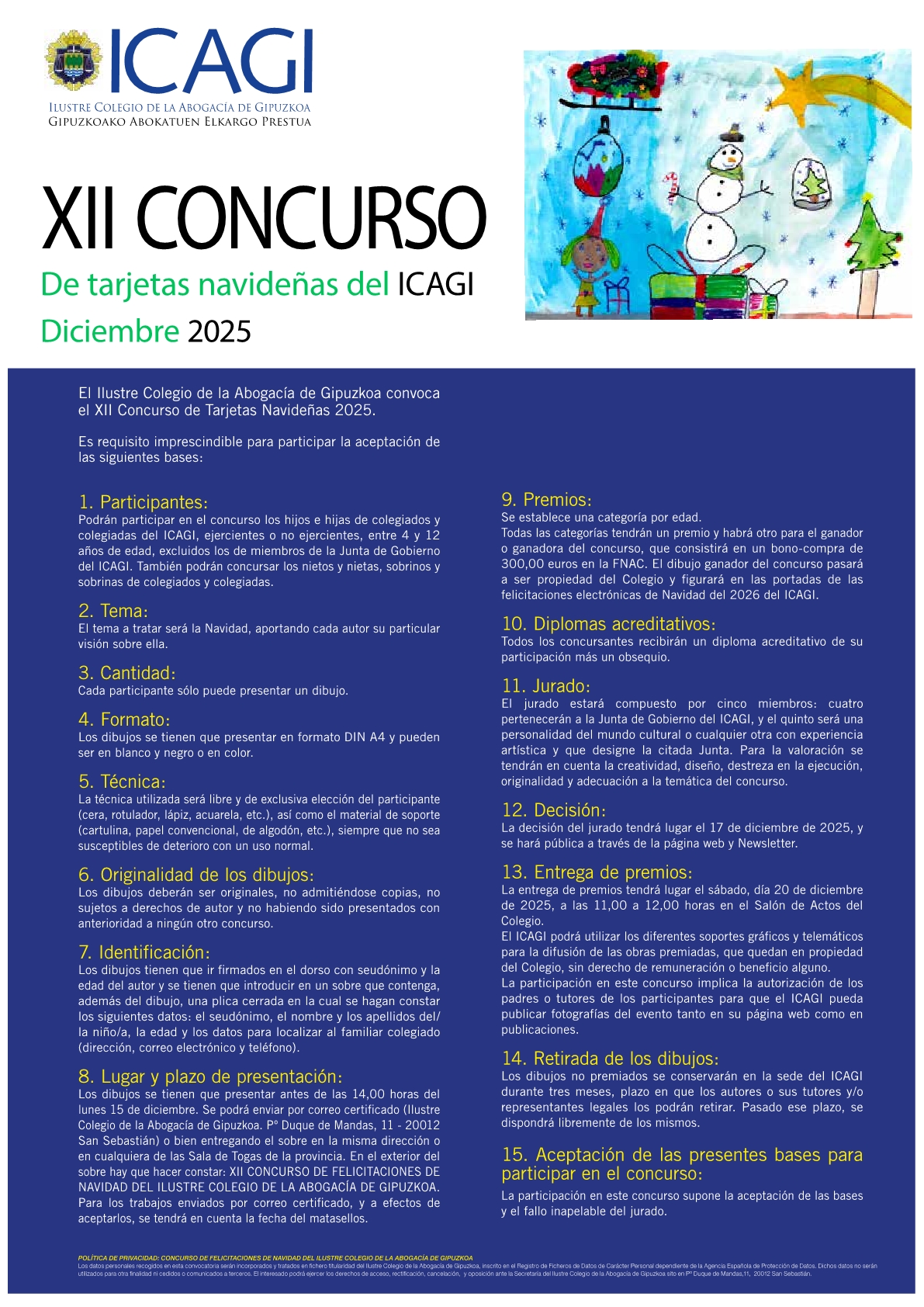 El Ilustre Colegio de la Abogacía de Gipuzkoa convoca el XII Concurso de Tarjetas Navideñas 2025. Fecha: 2025-10-28 (fuente: ICAGI) El plazo de presentación de los dibujos se amplía hasta las 14,00 horas del lunes 15 de diciembre.