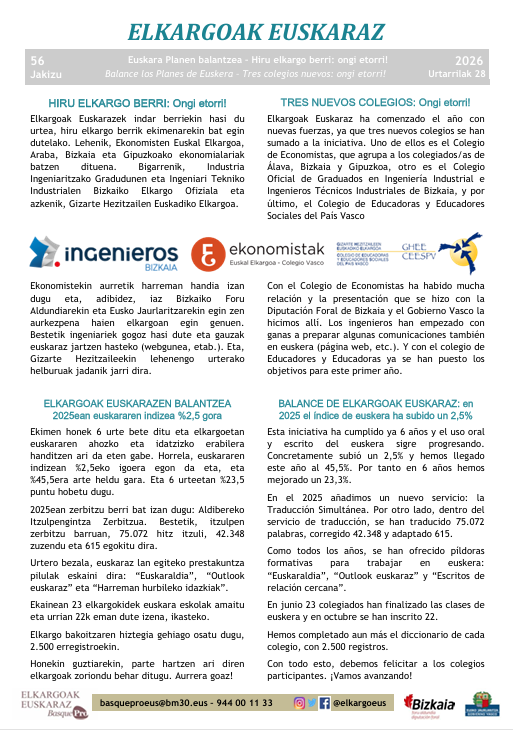 Ya está disponible el nuevo Jakizu Fecha: 2026-01-27 (fuente: Elkargoak Euskaraz) Ya está disponible el nuevo Jakizu, que incluye estas noticias: Nuevos colegios en el proyecto: Ongi etorri! Balance del 2025