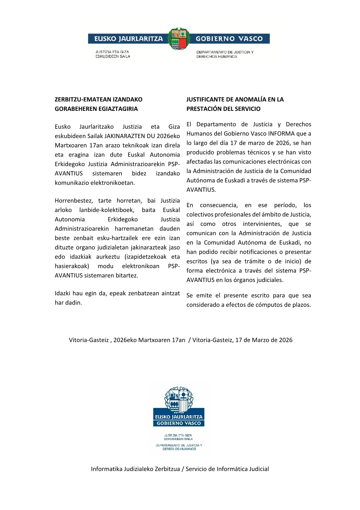 AVANTIUS - PSP. JUSTIFICANTE DE ANOMALÍA EN LA PRESTACIÓN DEL SERVICIO 17-03-2026 Fecha: 2026-03-17 (fuente: Informatika Judizialeko Zerbitzua / Servicio de Informática Judicial)