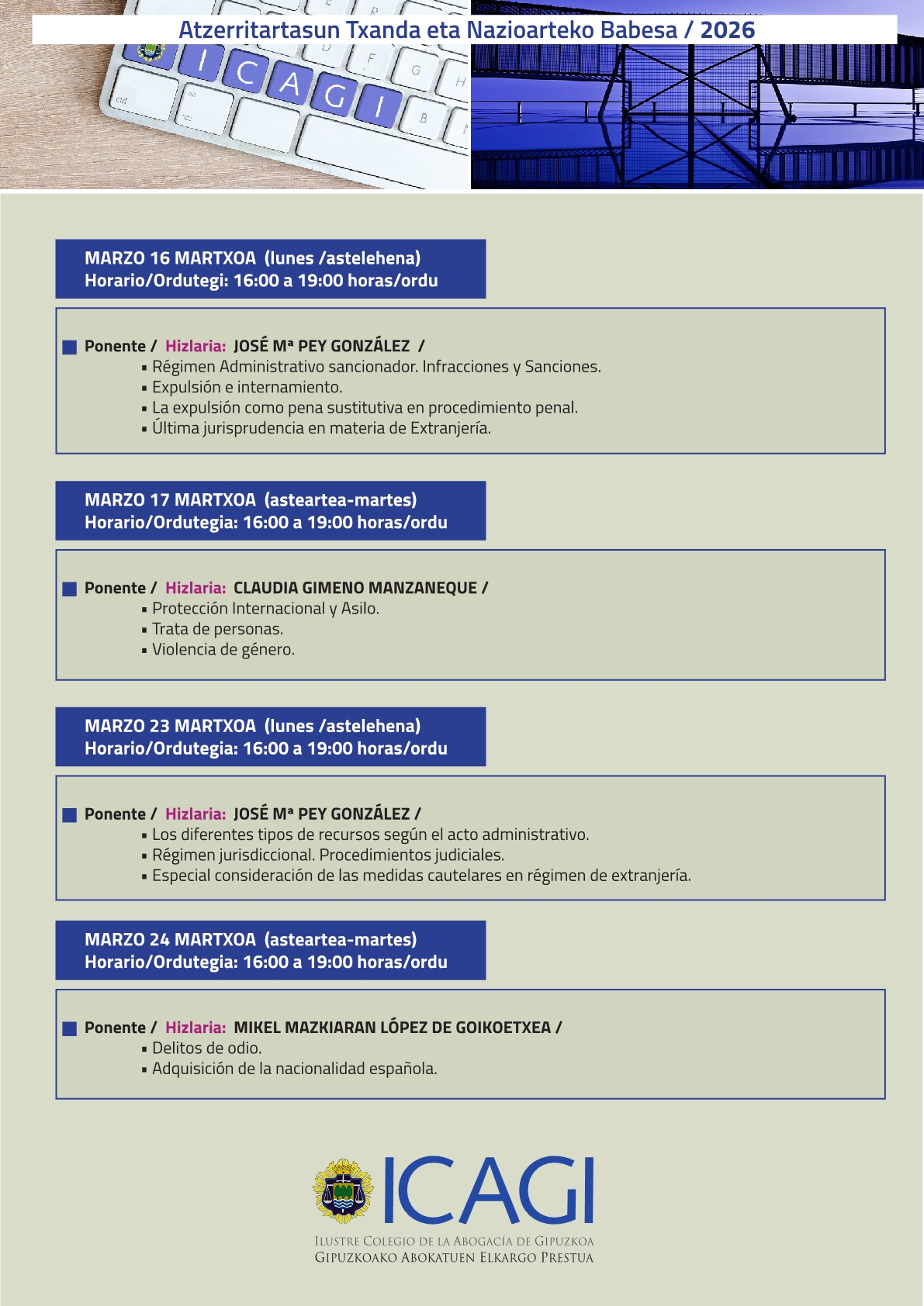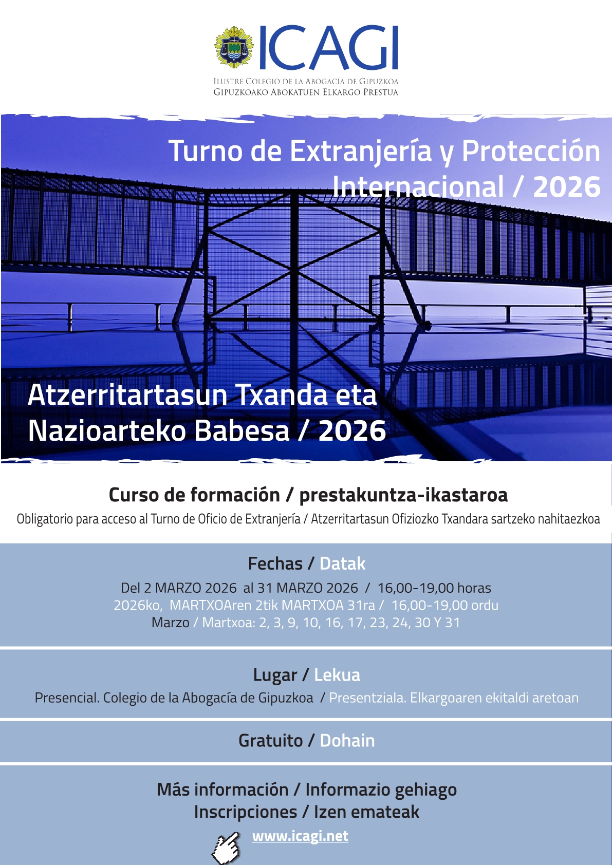 Este curso constituye un requisito obligatorio para acceder al Turno de Extranjería. Asimismo, se ofrece como actividad de formación continua destinada tanto a los profesionales ya inscritos en dicho turno como a cualquier persona colegiada que manifieste interés en la materia.